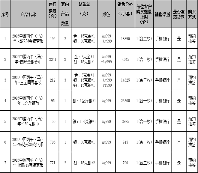 2026中国丙午(马)年贵金属纪念币采用“预约抽签”方式确定可购买的客户。本产品对应的每位客户购买数量上限等请见本公告第一条中“具体产品信息”内容。