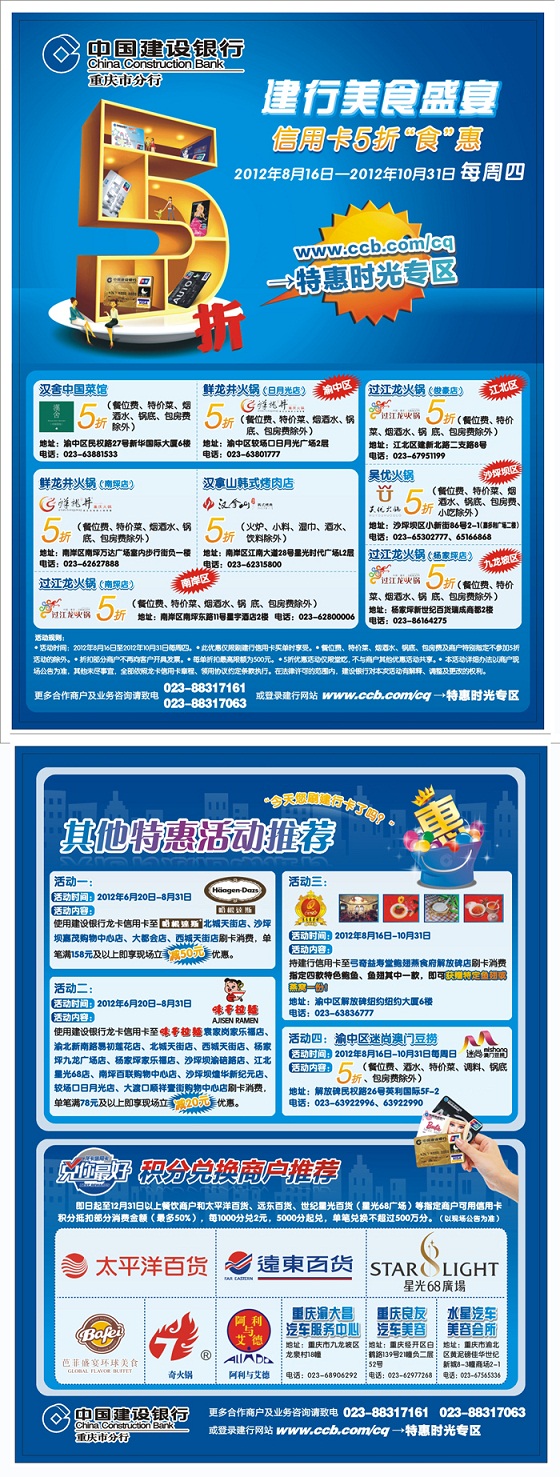2012年8月16日-2012年10月31日每周四,持龙卡信用卡在渝中区汉舍中国菜馆(新华国际店)、鲜龙井火锅(日月光店),江北区过江龙火锅(俊豪店),沙坪坝区吴优火锅,南岸区鲜龙井火锅(万达店)、过江龙火锅(星宇店)、汉拿山韩式烤肉(星光时代广场店),九龙坡区过江龙火锅8家餐饮商户内刷卡消费享5折优惠!