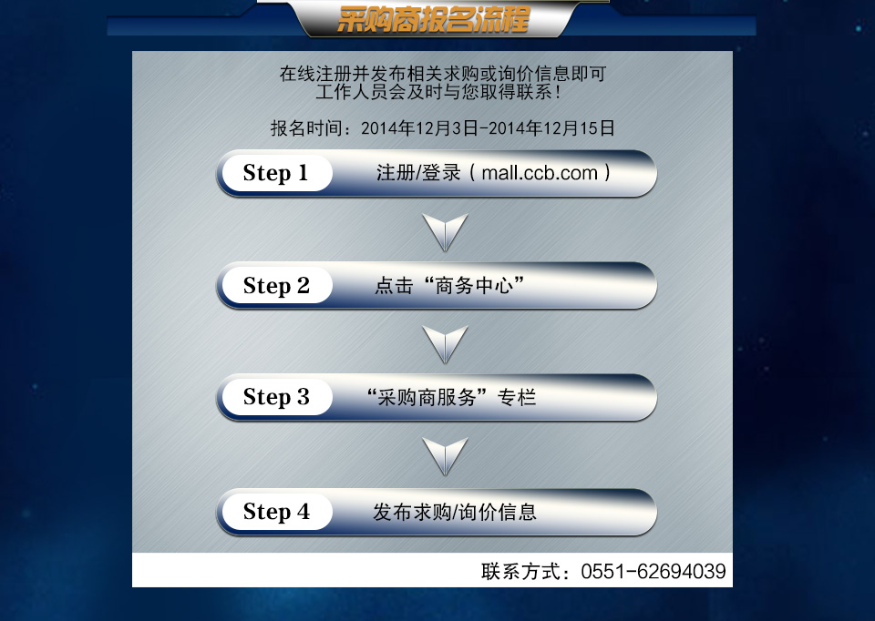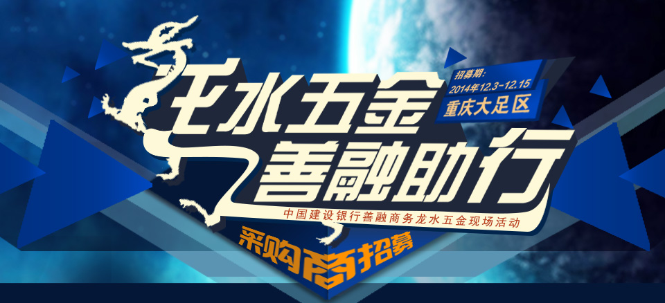 欢迎广大商户在线注册或登录善融商务企业商城(http://mall.ccb.com/),发布相关五金的求购或询价信息,有机会获得善融商务企业商城“龙水五金,善融助行”现场活动参与名额,届时建行重庆市分行将会对当天交易达标的采购商提供折扣补贴。活动报名时间:12月3日-12月15日。