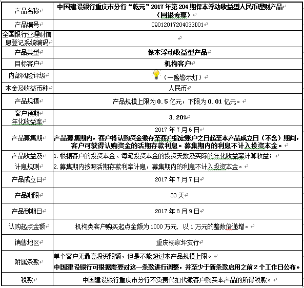 2.本产品规模下限:0.01亿元。在本期产品募集期内,对本期产品的认购金额未能达到本期理财产品规模下限,中国建设银行重庆市分行有权利但无义务宣布本期产品不成立。如产品不成立,中国建设银行将在通知客户产品不成立后1个工作日内返还客户已缴纳的认购本金至客户指定账户,客户应确保账户状态正常,并及时查询账户资金变动情况。