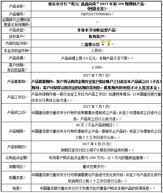 1.本期产品规模上限:0.5亿元。在本期产品募集期内,对本期产品的认购金额达到本期理财产品规模上限,则中国建设银行重庆市分行有权利但无义务停止本期产品的认购,已经认购成功的客户投资权益不受影响。