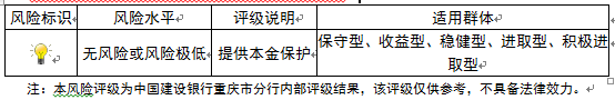 本期产品为保本浮动收益型理财产品,本理财产品有投资风险,只保障理财资金本金,不保证理财收益,您应当充分认识投资风险,谨慎投资。本期产品期限为59天(中国建设银行重庆市分行有权对产品进行展期或提前终止)。本期产品内部风险评级级别为一盏警示灯,风险程度属于无风险或风险极低,适用于保守型、收益型、稳健型、进取型及积极进取型投资者。最不利情况下,客户只能收回投资本金,不能获得任何投资收益。