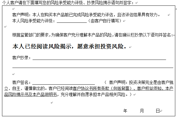 您在签署《中国建设银行股份有限公司理财产品客户协议书》前,应当仔细阅读客户权益须知、本风险揭示书及本产品的产品说明书的全部内容,同时向中国建设银行重庆市分行了解本产品的其他相关信息,并自己独立做出是否购买本产品的决定。