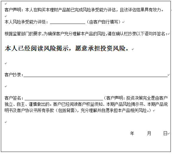 在您签署《中国建设银行股份有限公司理财产品客户协议书》前,应当仔细阅读客户权益须知、本风险揭示书及本产品的产品说明书的全部内容,同时向中国建设银行重庆市分行了解本产品的其他相关信息,并自己独立做出是否认(申)购本产品的决定。