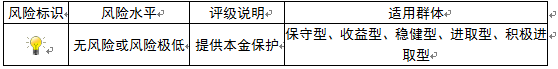 本期产品为保本浮动收益型理财产品,本理财产品有投资风险,只保障理财资金本金,不保证理财收益,您应当充分认识投资风险,谨慎投资。本期产品期限为34天(中国建设银行重庆市分行有权对产品进行展期或提前终止)。本期产品内部风险评级级别为一盏警示灯,风险程度属于无风险或风险极低,适用于保守型、收益型、稳健型、进取型及积极进取型投资者。最不利情况下,客户只能收回投资本金,不能获得任何投资收益。