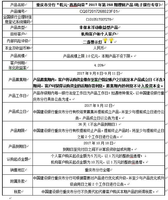3.中国建设银行重庆市分行可根据市场情况等调整产品规模上、下限,并最迟于调整规模上下限当日进行公告。