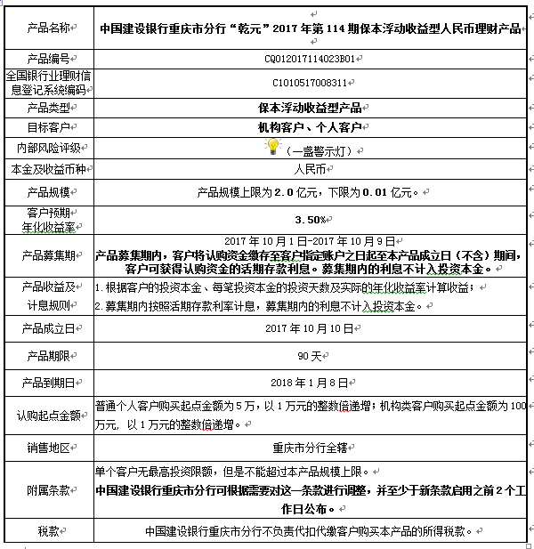 2.本产品规模下限:0.01亿元。在本期产品募集期内,对本期产品的认购金额未能达到本期理财产品规模下限,中国建设银行重庆市分行有权利但无义务宣布本期产品不成立。如产品不成立,中国建设银行重庆市分行将在通知客户产品不成立后1个工作日内返还客户已缴纳的认购本金至客户指定账户,客户应确保账户状态正常,并及时查询账户资金变动情况。