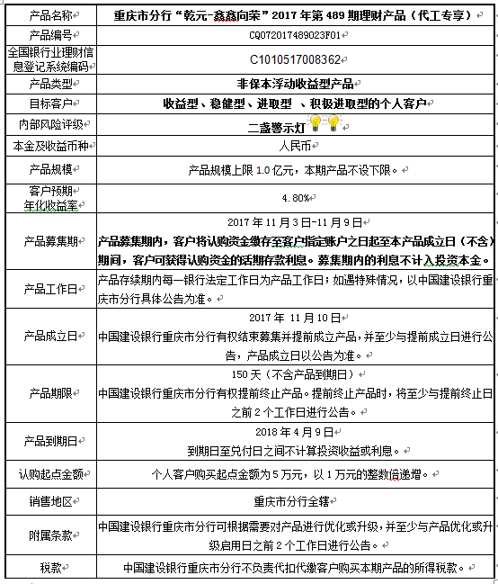 1.本期产品规模上限:1.0亿元。在本期产品募集期内,对本期产品的认购金额达到本期理财产品规模上限,则中国建设银行重庆市分行有权利但无义务停止本期产品的认购,已经认购成功的客户投资权益不受影响。