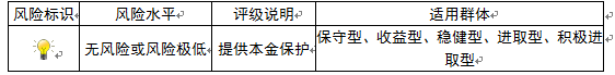 ,风险程度属于无风险或风险极低,适用于保守型、收益型、稳健型、进取型及积极进取型投资者。最不利情况下,客户只能收回投资本金,不能获得任何投资收益。