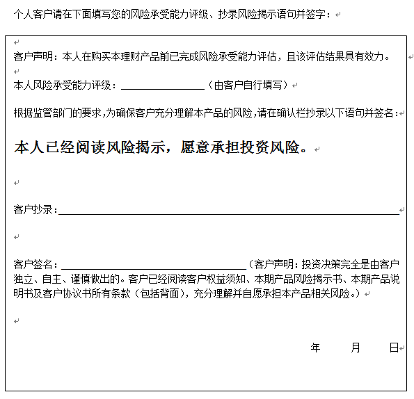 在您签署《中国建设银行股份有限公司理财产品客户协议书》前,应当仔细阅读客户权益须知、本风险揭示书及本产品的产品说明书的全部内容,同时向中国建设银行了解本产品的其他相关信息,并自己独立做出是否认(申)购本产品的决定。