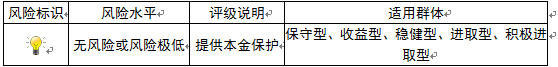 ,风险程度属于无风险或风险极低,适用于保守型、收益型、稳健型、进取型及积极进取型投资者。最不利情况下,客户只能收回投资本金,不能获得任何投资收益。