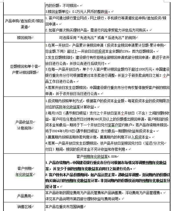 3.中国建设银行重庆市分行可根据市场和产品运行情况等调整产品存续期规模上下限,并至少于调整规模上下限之日之前进行公告。