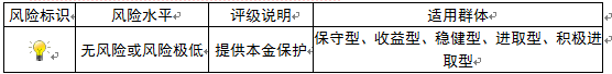 ,风险程度属于无风险或风险极低,适用于保守型、收益型、稳健型、进取型及积极进取型投资者。最不利情况下,客户只能收回投资本金,不能获得任何投资收益。