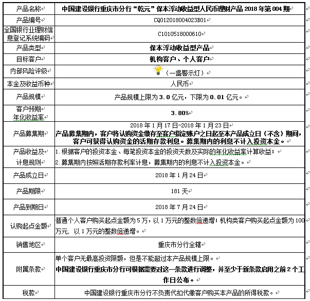 本期产品为保本浮动收益型理财产品,本理财产品有投资风险,只保障理财资金本金,不保证理财收益,您应当充分认识投资风险,谨慎投资。本期产品期限为181天(中国建设银行重庆市分行有权对产品进行展期或提前终止)。本期产品内部风险评级级别为一盏警示灯