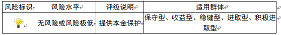 ,风险程度属于无风险或风险极低,适用于保守型、收益型、稳健型、进取型及积极进取型投资者。最不利情况下,客户只能收回投资本金,不能获得任何投资收益。