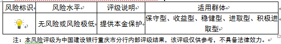 本期产品为保本浮动收益型理财产品,本理财产品有投资风险,只保障理财资金本金,不保证理财收益,您应当充分认识投资风险,谨慎投资。本期产品期限为180天(中国建设银行重庆市分行有权对产品进行展期或提前终止)。本期产品内部风险评级级别为一盏警示灯,风险程度属于无风险或风险极低,适用于保守型、收益型、稳健型、进取型及积极进取型投资者。最不利情况下,客户只能收回投资本金,不能获得任何投资收益。
