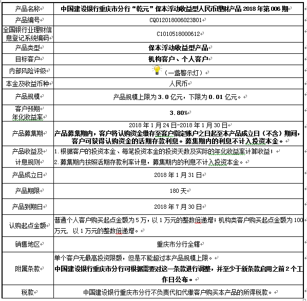 中国建设银行重庆市分行“乾元”保本浮动收益型 人民币理财产品2018年第006期风险揭示书和产品说明书