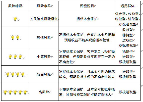 本产品为非保本浮动收益型理财产品,不保证本金和收益,请您充分认识投资风险,谨慎投资。本期产品期限为91天(中国建设银行有权对产品进行展期或提前终止),存续期内,产品不接受申购或赎回申请。本期产品内部风险评级级别为盏警示灯 ,风险水平属于较低风险。最不利情况下,您将损失全部收益甚至包括全部本金。本理财产品适用于收益型、稳健型、进取型 积极进取型客户。