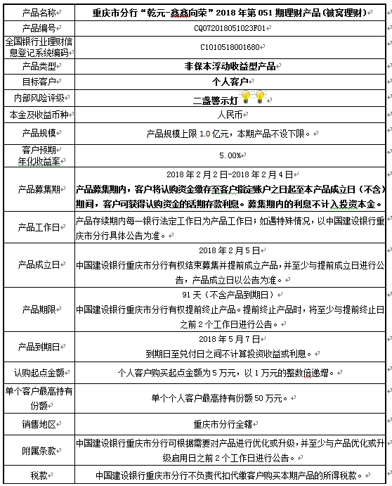 本产品为非保本浮动收益型理财产品,不保证本金和收益,请您充分认识投资风险,谨慎投资。本期产品期限为91天(中国建设银行有权对产品进行展期或提前终止),存续期内,产品不接受申购或赎回申请。本期产品内部风险评级级别为二盏警示灯