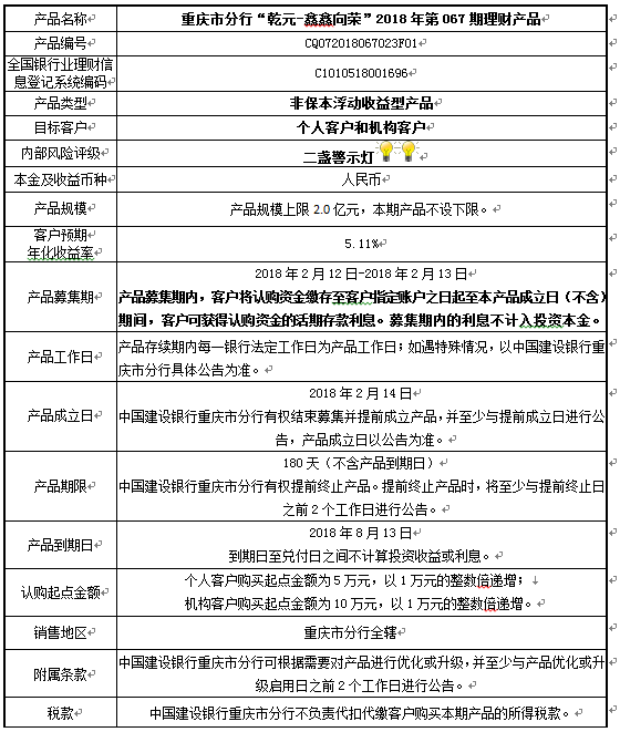 1.本期产品规模上限:2.0亿元。在本期产品募集期内,对本期产品的认购金额达到本期理财产品规模上限,则中国建设银行重庆市分行有权利但无义务停止本期产品的认购,已经认购成功的客户投资权益不受影响。
