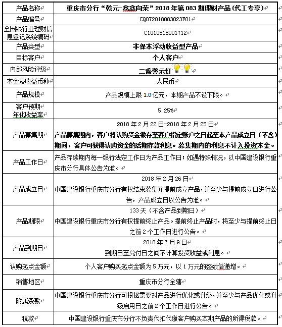 1.本期产品规模上限:1.0亿元。在本期产品募集期内,对本期产品的认购金额达到本期理财产品规模上限,则中国建设银行重庆市分行有权利但无义务停止本期产品的认购,已经认购成功的客户投资权益不受影响。