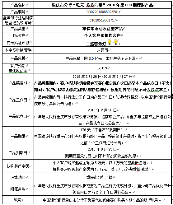 3.中国建设银行重庆市分行可根据市场情况等调整产品规模上、下限,并最迟于调整规模上下限当日进行公告。