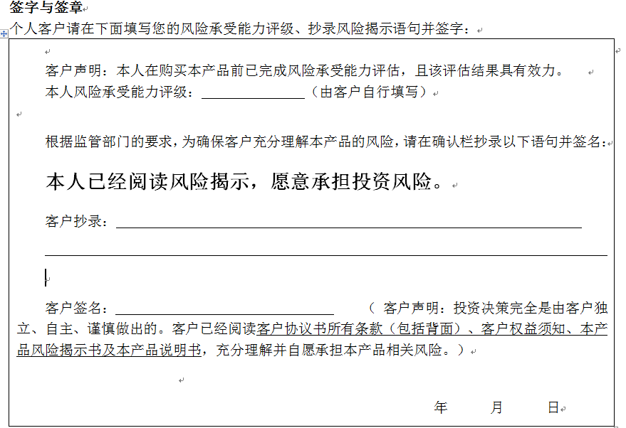 您签署本风险揭示书、客户协议书,并将资金委托给中国建设银行重庆市分行运作是您真实的意思表示。本风险揭示书及相应的客户协议书、产品说明书、客户权益须知将共同构成贵我双方理财合同的有效组成部分。