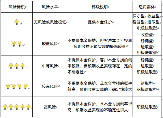 本产品为非保本浮动收益型理财产品,不保证本金和收益,请您充分认识投资风险,谨慎投资。本期产品期限为249天(中国建设银行有权对产品进行展期或提前终止),存续期内,产品不接受申购或赎回申请。本期产品内部风险评级级别为三盏警示灯 ,风险水平属于中等风险。最不利情况下,您将损失全部收益甚至包括全部本金。本理财产品适用于稳健型、进取型 、积极进取型客户。
