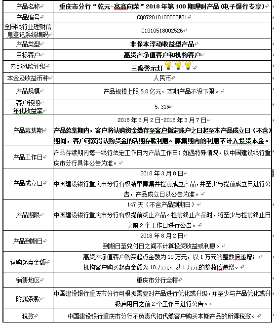 1.本期产品规模上限:5.0亿元。在本期产品募集期内,对本期产品的认购金额达到本期理财产品规模上限,则中国建设银行重庆市分行有权利但无义务停止本期产品的认购,已经认购成功的客户投资权益不受影响。