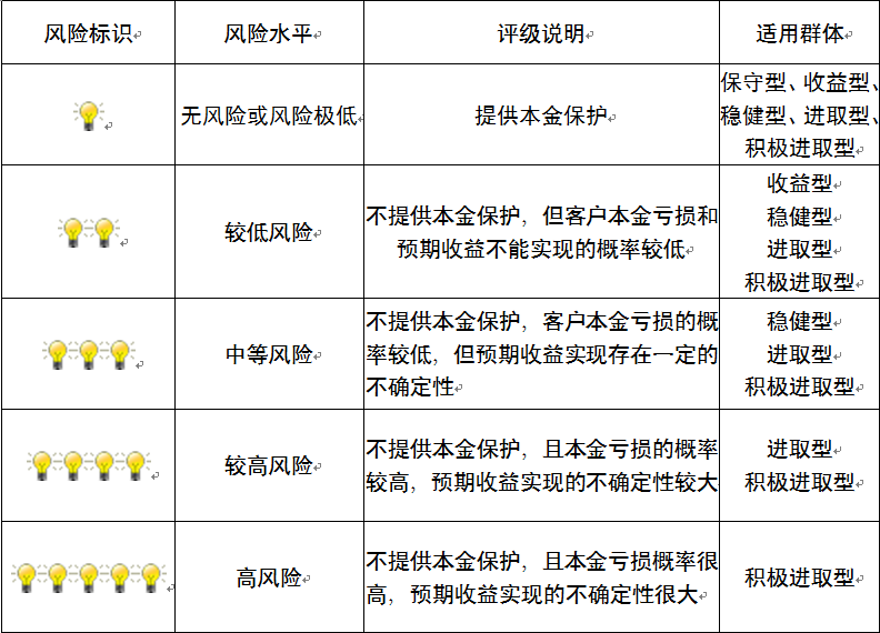 本产品为非保本浮动收益型理财产品,不保证本金和收益,请您充分认识投资风险,谨慎投资。本期产品期限为105天(中国建设银行有权对产品进行展期或提前终止),存续期内,产品不接受申购或赎回申请。本期产品内部风险评级级别为二盏警示灯 ,风险水平属于较低风险。最不利情况下,您将损失全部收益甚至包括全部本金。本理财产品适用于收益型、稳健型、进取型 、积极进取型客户。