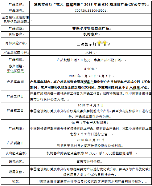本产品为非保本浮动收益型理财产品,不保证本金和收益,请您充分认识投资风险,谨慎投资。本期产品期限为45天(中国建设银行有权对产品进行展期或提前终止),存续期内,产品不接受申购或赎回申请。本期产品内部风险评级级别为二盏警示灯