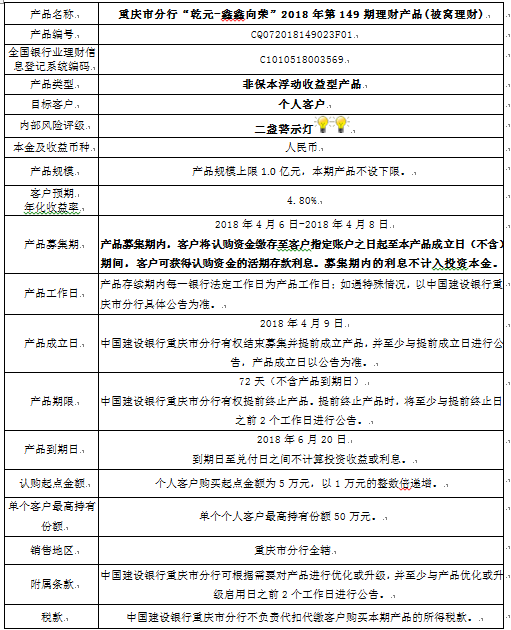 3.中国建设银行重庆市分行可根据市场情况等调整产品规模上、下限,并最迟于调整规模上下限当日进行公告。