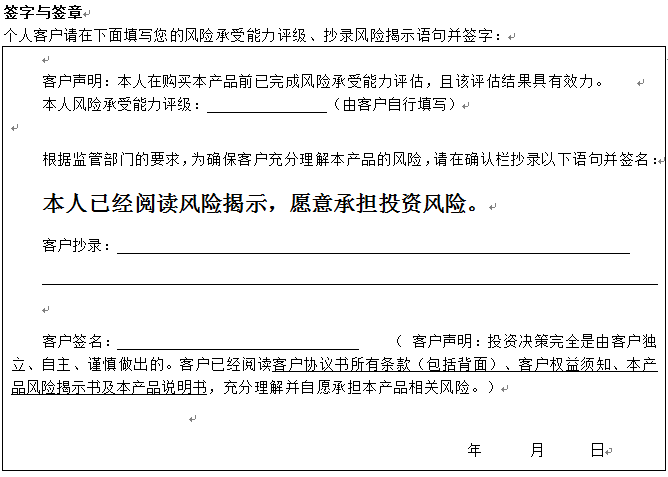 您签署本风险揭示书、客户协议书,并将资金委托给中国建设银行重庆市分行运作是您真实的意思表示。本风险揭示书及相应的客户协议书、产品说明书、客户权益须知将共同构成贵我双方理财合同的有效组成部分。