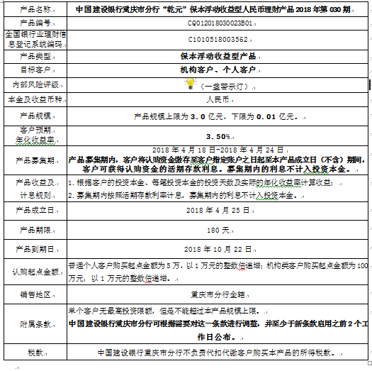 本期产品为保本浮动收益型理财产品,本理财产品有投资风险,只保障理财资金本金,不保证理财收益,您应当充分认识投资风险,谨慎投资。本期产品期限为180天(中国建设银行重庆市分行有权对产品进行展期或提前终止)。本期产品内部风险评级级别为一盏警示灯