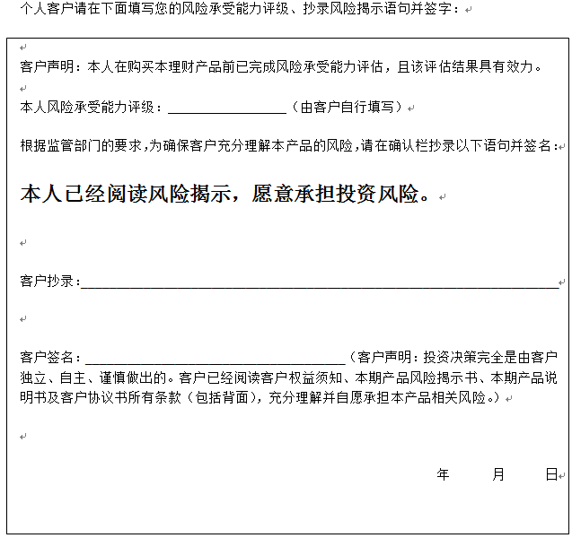在您签署《中国建设银行股份有限公司理财产品客户协议书》前,应当仔细阅读客户权益须知、本风险揭示书及本产品的产品说明书的全部内容,同时向中国建设银行重庆市分行了解本产品的其他相关信息,并自己独立做出是否认(申)购本产品的决定。