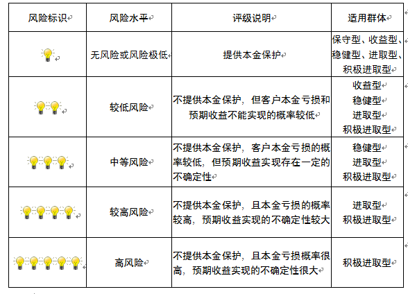本产品为非保本浮动收益型理财产品,不保证本金和收益,请您充分认识投资风险,谨慎投资。本期产品期限为122天(中国建设银行有权对产品进行展期或提前终止),存续期内,产品不接受申购或赎回申请。本期产品内部风险评级级别为三盏警示灯 ,风险水平属于中等风险。最不利情况下,您将损失全部收益甚至包括全部本金。本理财产品适用于稳健型、进取型 、积极进取型客户。