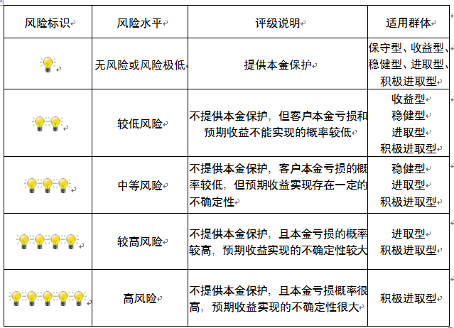 本产品为非保本浮动收益型理财产品,不保证本金和收益,请您充分认识投资风险,谨慎投资。本期产品期限为363天(中国建设银行有权对产品进行展期或提前终止),存续期内,产品不接受申购或赎回申请。本期产品内部风险评级级别为盏警示灯 ,风险水平属于较低风险。最不利情况下,您将损失全部收益甚至包括全部本金。本理财产品适用于收益型、稳健型、进取型 积极进取型客户。