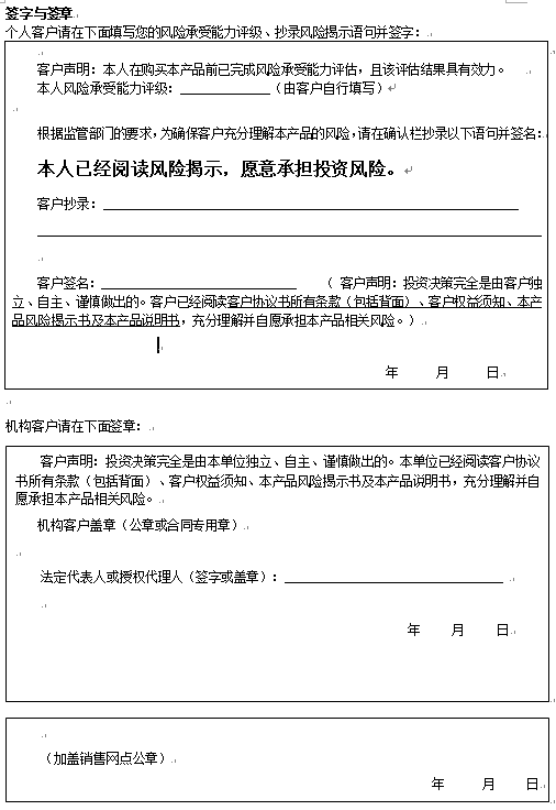 您签署本风险揭示书、客户协议书,并将资金委托给中国建设银行重庆市分行运作是您真实的意思表示。本风险揭示书及相应的客户协议书、产品说明书、客户权益须知将共同构成贵我双方理财合同的有效组成部分。
