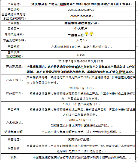 1.本期产品规模上限:1.0亿元。在本期产品募集期内,对本期产品的认购金额达到本期理财产品规模上限,则中国建设银行重庆市分行有权利但无义务停止本期产品的认购,已经认购成功的客户投资权益不受影响。