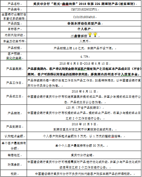 1.本期产品规模上限:1.0亿元。在本期产品募集期内,对本期产品的认购金额达到本期理财产品规模上限,则中国建设银行重庆市分行有权利但无义务停止本期产品的认购,已经认购成功的客户投资权益不受影响。