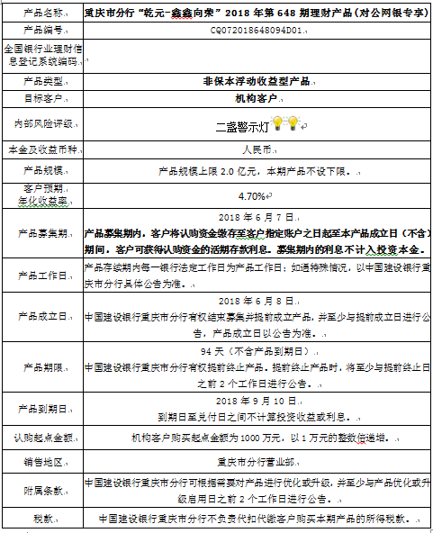3.中国建设银行重庆市分行可根据市场情况等调整产品规模上、下限,并最迟于调整规模上下限当日进行公告。