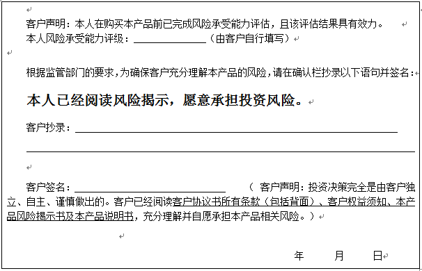 个人客户请在下面填写您的风险承受能力评级、抄录风险揭示语句并签字: