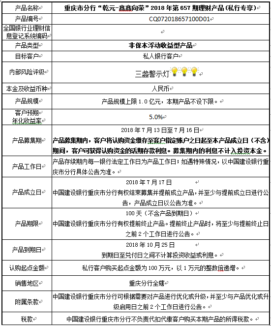 1.本期产品规模上限:1.0亿元。在本期产品募集期内,对本期产品的认购金额达到本期理财产品规模上限,则中国建设银行重庆市分行有权利但无义务停止本期产品的认购,已经认购成功的客户投资权益不受影响。