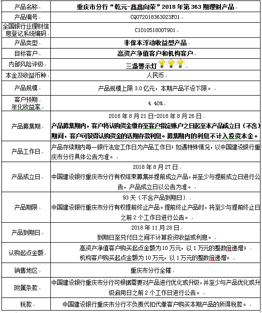 3.中国建设银行重庆市分行可根据市场情况等调整产品规模上、下限,并最迟于调整规模上下限当日进行公告。