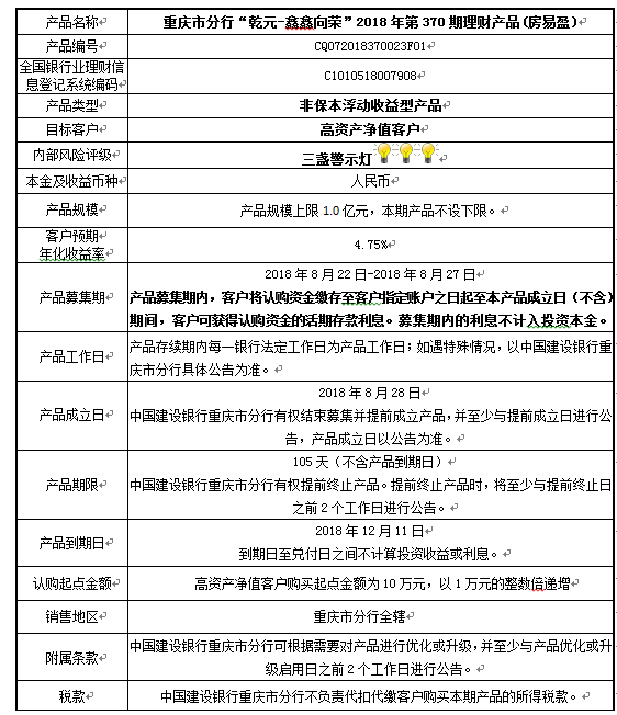 本产品为非保本浮动收益型理财产品,不保证本金和收益,请您充分认识投资风险,谨慎投资。本期产品期限为105天(中国建设银行有权对产品进行展期或提前终止),存续期内,产品不接受申购或赎回申请。本期产品内部风险评级级别为三盏警示灯 ,风险水平属于中等风险。最不利情况下,您将损失全部收益甚至包括全部本金。本理财产品适用于稳健型、进取型 、积极进取型客户。