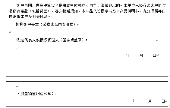 客户签名: ( 客户声明:投资决策完全是由客户独立、自主、谨慎做出的。客户已经阅读客户协议书所有条款(包括背面)、客户权益须知、本产品风险揭示书及本产品说明书,充分理解并自愿承担本产品相关风险。)
