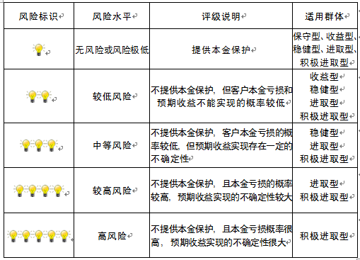 本产品为非保本浮动收益型理财产品,不保证本金和收益,请您充分认识投资风险,谨慎投资。本期产品期限为127天(中国建设银行有权对产品进行展期或提前终止),存续期内,产品不接受申购或赎回申请。本期产品内部风险评级级别为三盏警示灯 ,风险水平属于中等风险。最不利情况下,您将损失全部收益甚至包括全部本金。本理财产品适用于稳健型、进取型 、积极进取型客户。