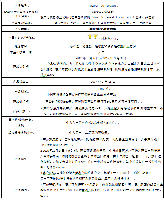 本产品为非保本浮动收益型理财产品,不保证本金和收益,请您充分认识投资风险,谨慎投资。产品期限为1387天(中国建设银行重庆市分行有权提前终止或展期产品),产品存续期内任一自然日接受申购/追加投资申请,客户可对持有360天及以上的份额提出赎回申请(超过单个客户累计赎回限额的赎回申请除外,巨额赎回时请以公告为准)。产品内部风险评级级别为二盏警示灯,风险程度属于较低风险。最不利情况下,基础资产无法回收任何本金和收益,客户将损失全部本金。产品适合于收益型、稳健型、进取型、积极进取型客户。