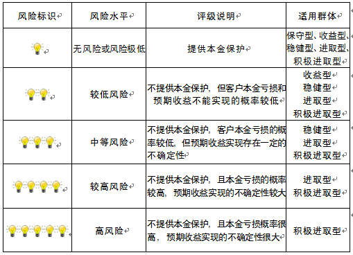 本产品为非保本浮动收益型理财产品,不保证本金和收益,请您充分认识投资风险,谨慎投资。本期产品期限为160天(中国建设银行有权对产品进行展期或提前终止),存续期内,产品不接受申购或赎回申请。本期产品内部风险评级级别为二盏警示灯 ,风险水平属于较低风险。最不利情况下,您将损失全部收益甚至包括全部本金。本理财产品适用于收益型、稳健型、进取型 、积极进取型客户。