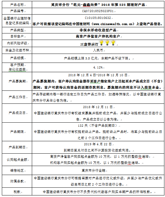 3.中国建设银行重庆市分行可根据市场情况等调整产品规模上、下限,并最迟于调整规模上下限当日进行公告。
